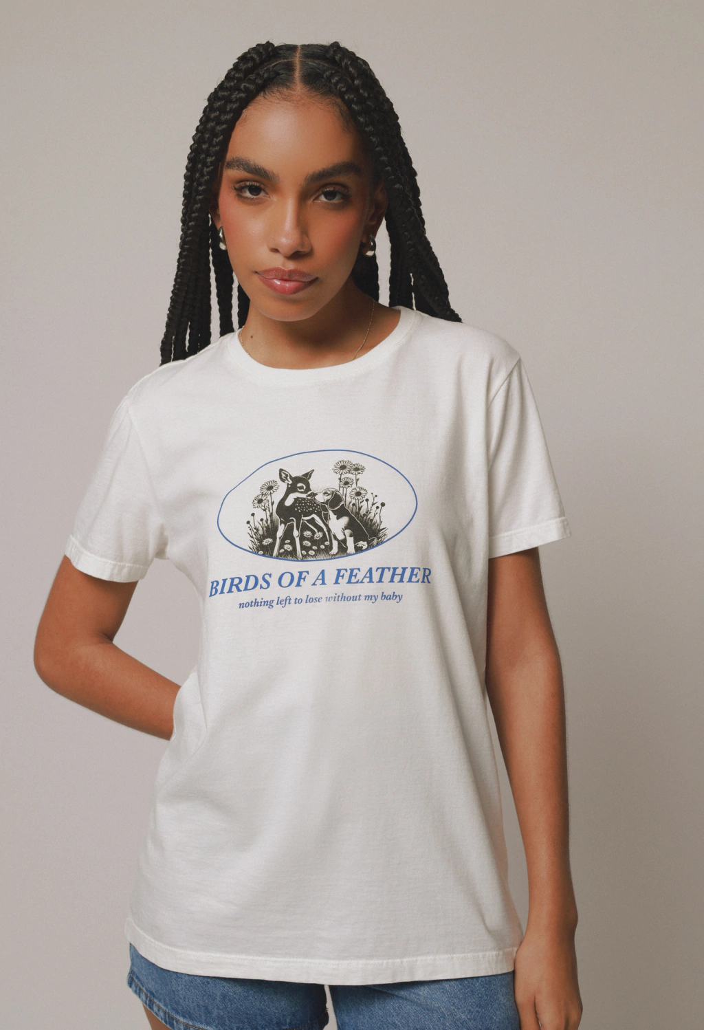 Modelo 2 veste camiseta PP. Medidas modelo: 61 cm cintura | 95 cm quadril | 1,74 cm altura | busto 80cm.